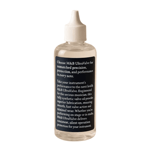 M&B UltraValve er en profesjonell, helsyntetisk ventilolje utviklet for musikere som ønsker jevn og pålitelig respons. Den avanserte formelen gir effektiv smøring, reduserer friksjon og bidrar til stillegående og presis ventilbevegelse.